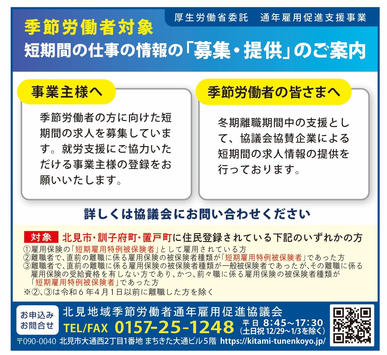 協議会では、季節労働者の方に向けた短期間の求人を募集しております。
