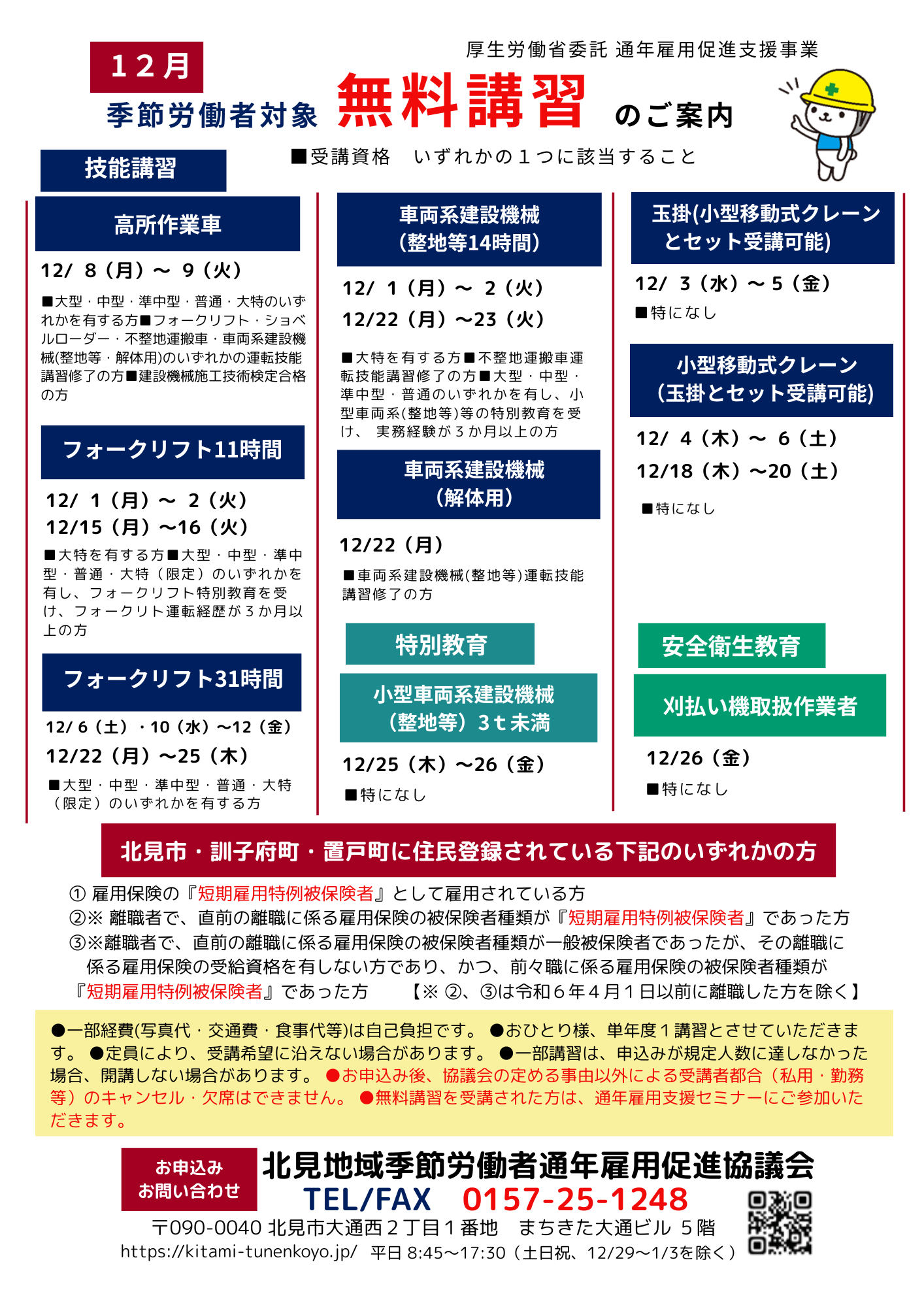 【受付中】無料技能講習(12月)の日程について